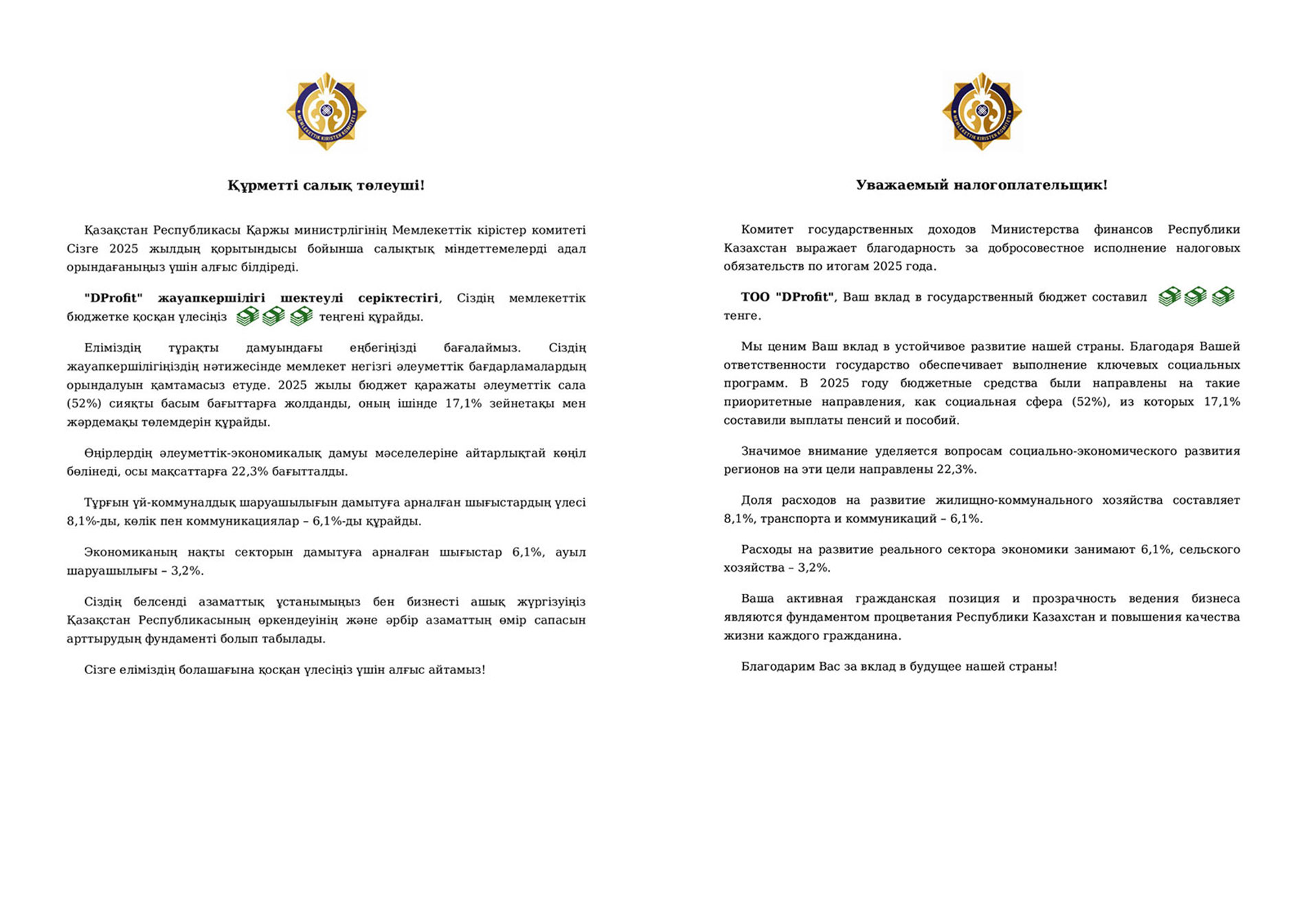 рады сообщить что Комитет государственных доходов Министерства финансов Республики Казахстан выразил благодарность нашей компании, ТОО «DProfit», добросовестное исполнение налоговых обязательств по итогам 2025 года.